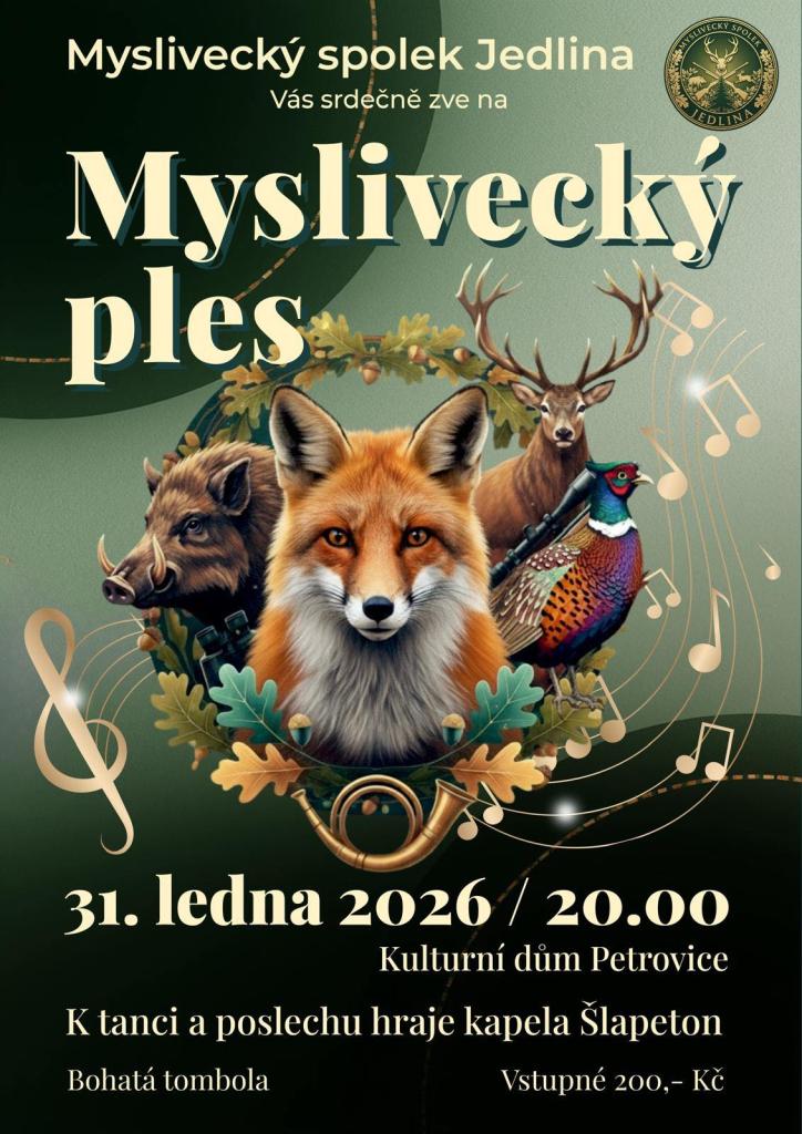 Myslivecký spolek Jedlina Václavy vás srdečně zve na Myslivecký ples, který se koná 31. ledna 2026 od 20:00 v kulturním domě v Petrovicích. K tanci a poslechu zahraje oblíbená kapela Šlapeton, která se postará o skvělou atmosféru. Těšit se můžete také na bohatou tombolu, která obohatí celou akci. Přijďte se pobavit a užít si večer plný zábavy a přátelské atmosféry.
