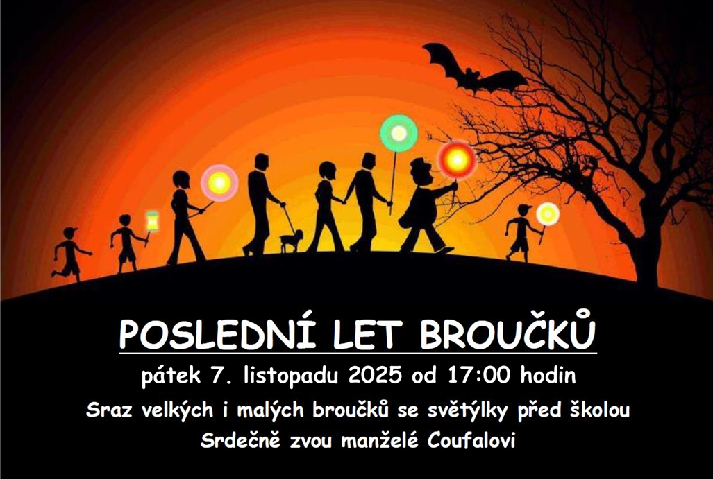 Poslední let broučků se uskuteční v pátek 7. 11. 2025. Sraz je před budou ZŠ a MŠ v 17 hodin a poté se společně vydáme uspávat broučky a berušky. Nezapomeňte lampiony či jiná světélka.