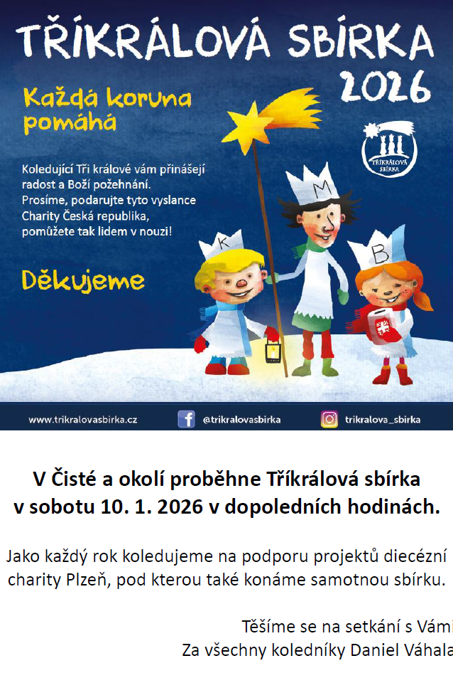 V sobotu 10. 1. 2026 v dopoledních hodinách proběhne Tříkrálová sbírka po Čisté a okolních vesnicí.